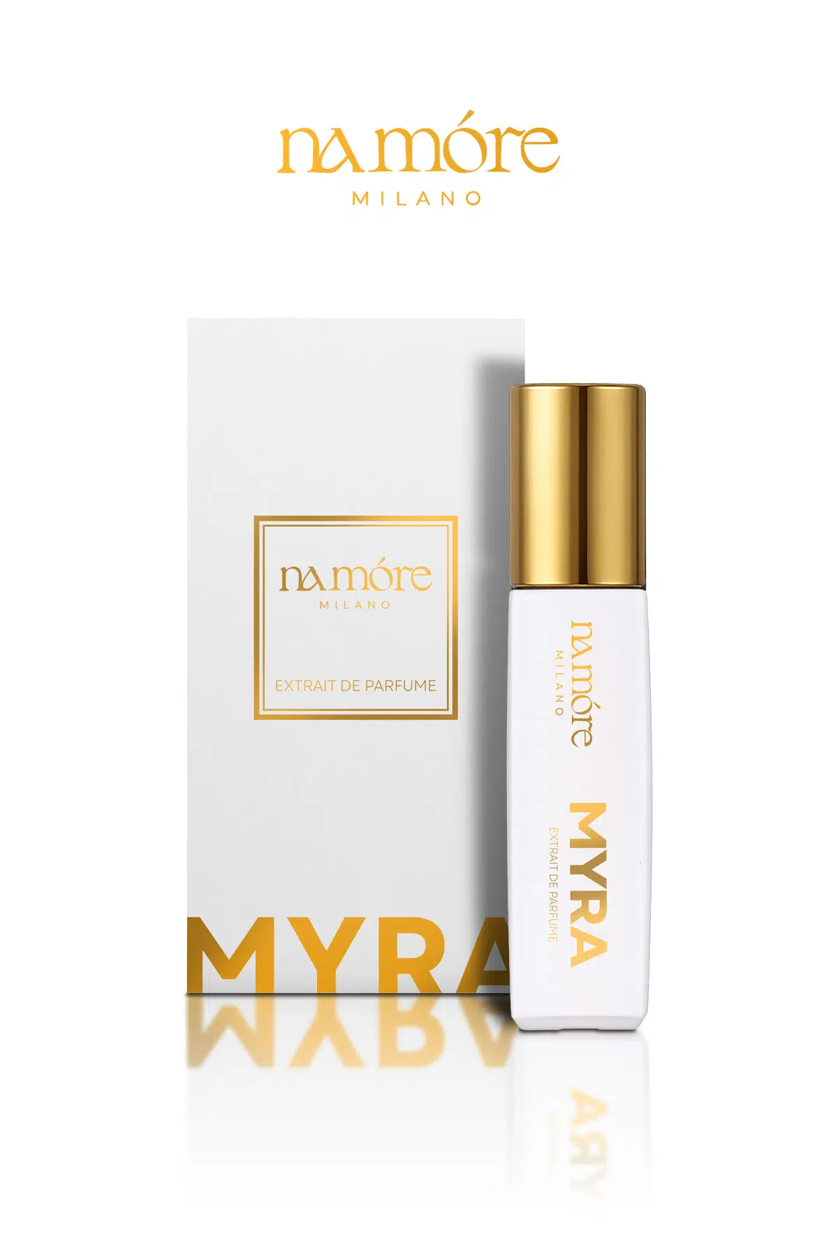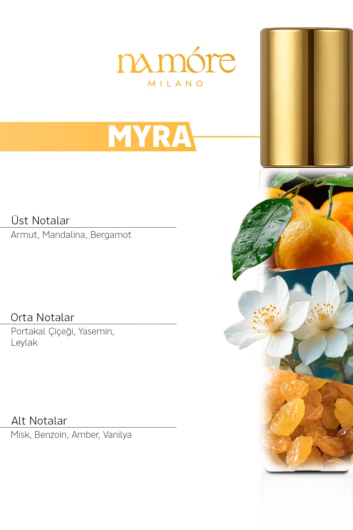 MYRA Extrait de Parfum — Zengin esansı ve uzun süren etkisiyle gün boyu teninizde taze bir imza bırakır. Armut ve portakal çiçeğinin ferah meyveli-çiçeksi notalarıyla açılan koku, miskin derin ve yumuşak dokusuyla dengelenir. Bu yüksek esanslı formül, parfüm yağlarının yoğunluğunu artırarak olağanüstü bir kalıcılık sunar.