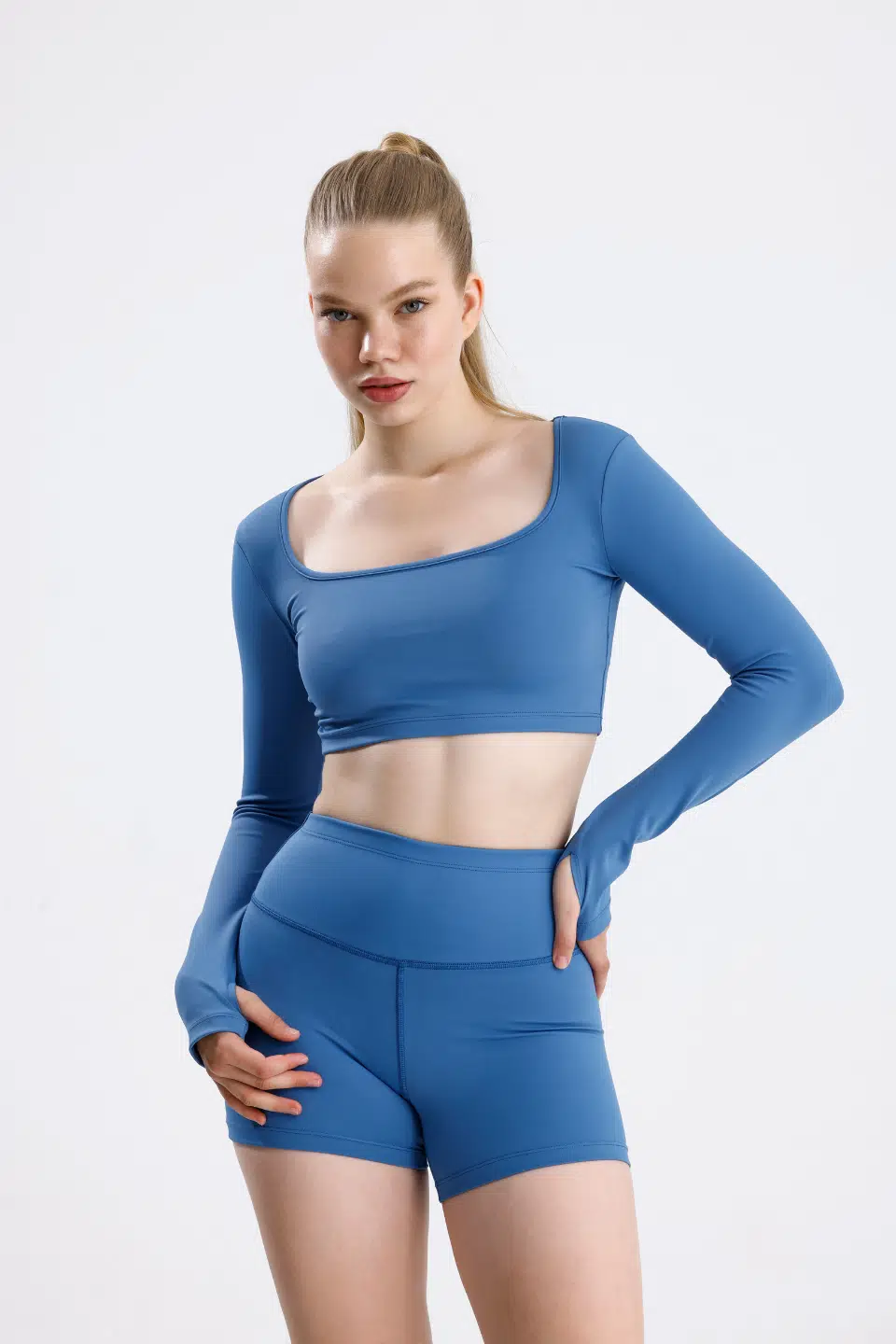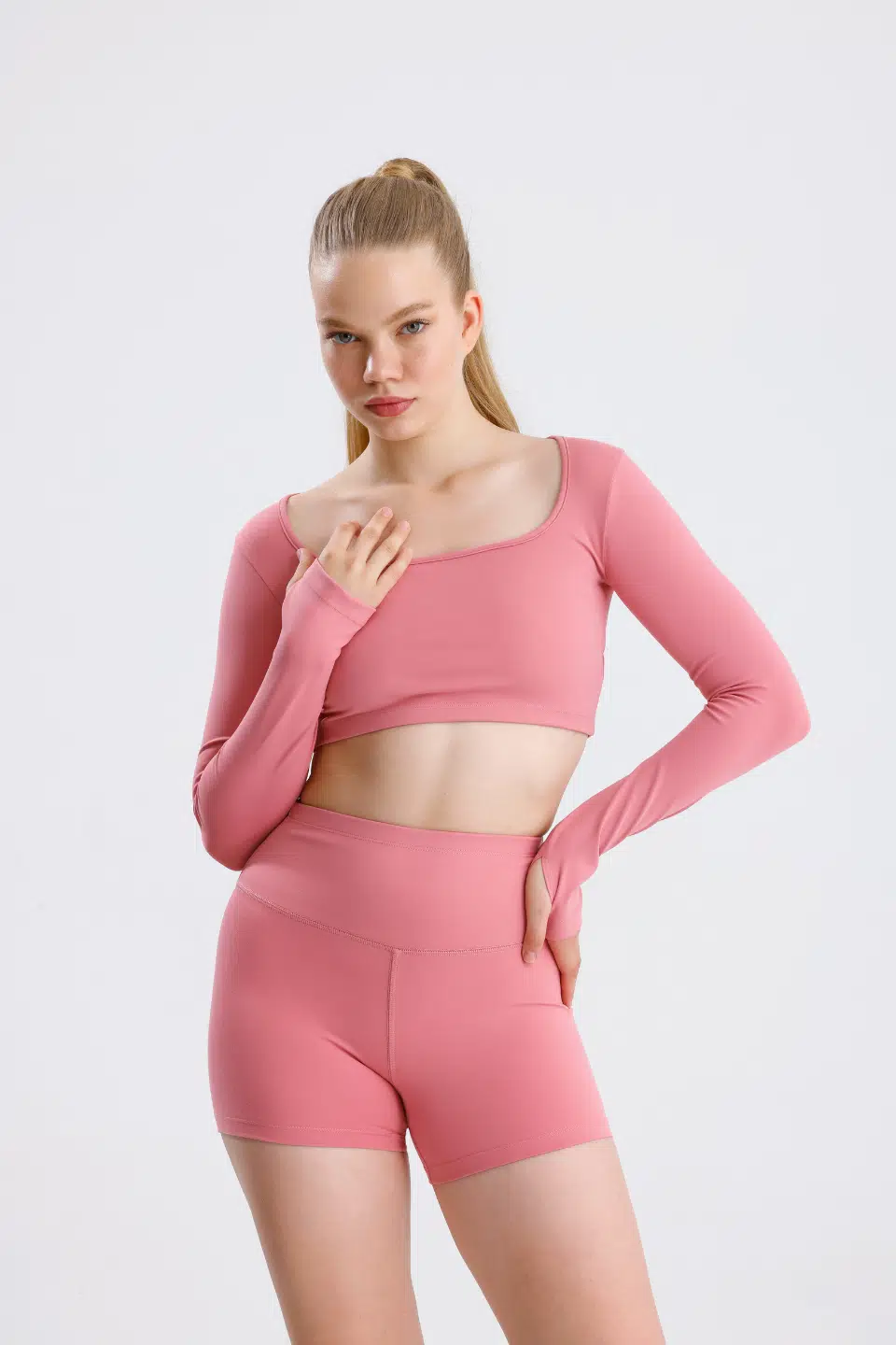 "Uzun kollu ve bisiklet yaka crop tişört. Dayanıklı, nefes alabilir kumaş. Lazer kesim."