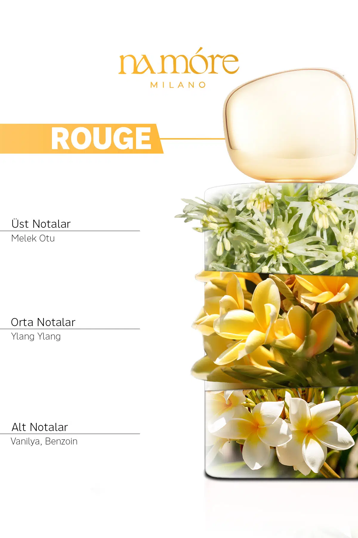 Rouge Extrait, melek otu’nun zarif bitkisel tazeliği, ylang-ylang’ın çiçeksi zarafeti ve vanilya’nın sıcak tatlı dokunuşuyla buluşan, sofistike ve dikkat çekici bir kadın parfümüdür. 50 ml’lik ideal boyuyla günlük hayattan özel akşamlara, gündüzden geceye kadar her zaman seninle.