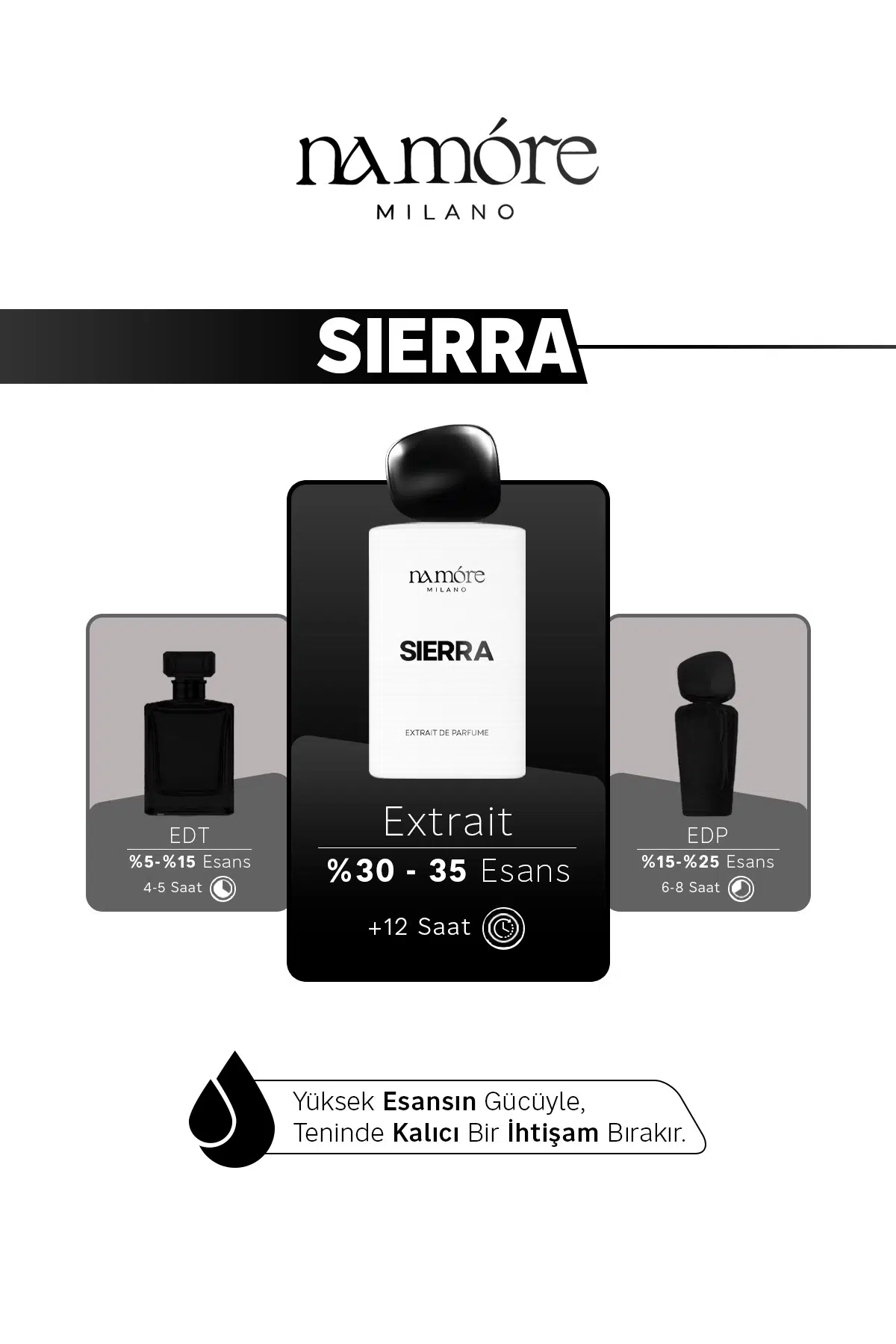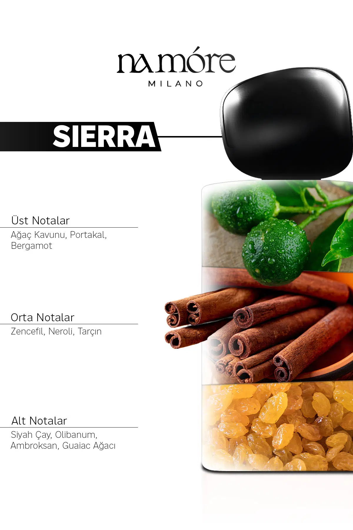 Sierra Extrait, portakalın enerjik ferahlığı, tarçının sıcak baharatlı dokunuşu ve olibanumun (tütsü/odunsu) derinliği ile birleşen modern ve maskülen bir erkek parfümüdür. 50 ml’lik kompakt boyuyla şehir hayatında, işte, sporda veya akşam davetlerinde güçlü bir imza bırakmak isteyen erkekler için özel olarak tasarlanmıştır.