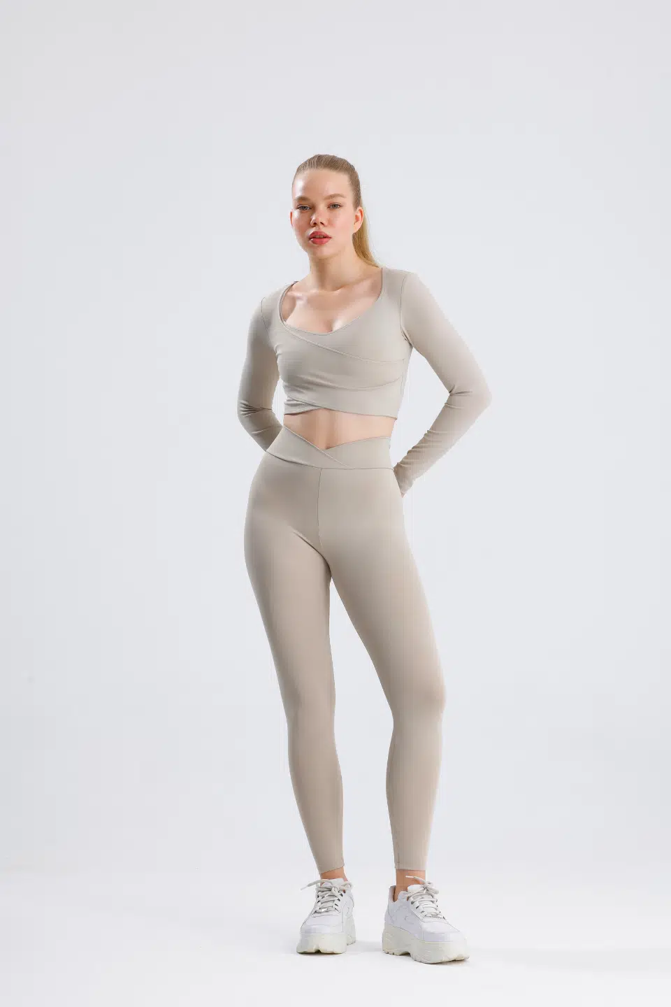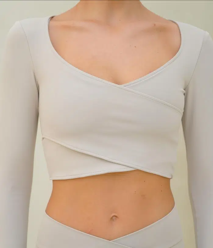 Önü geniş çapraz şerit detaylı uzun kollu Comfortlux crop. Dayanıklı, nefes alabilir kumaş